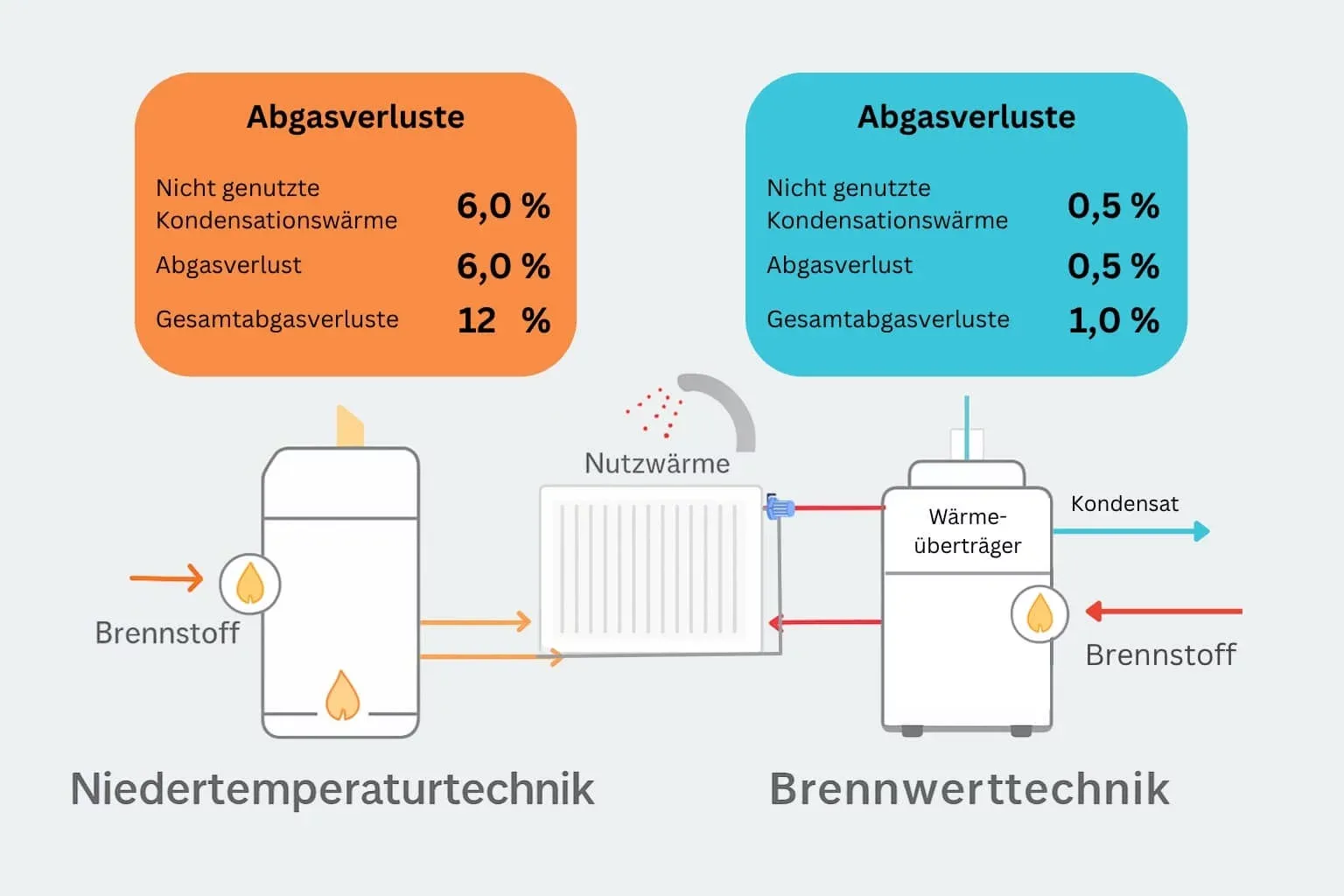 Bei der Verbrennung von Heizöl entstehen heiße Abgase, die bei älteren Heizungen ungenutzt durch den Schornstein entweichen. Ein Öl-Brennwertkessel kühlt diese Abgase so weit ab, dass der darin enthaltene Wasserdampf kondensiert. Die dabei frei werdende Wärme wird zusätzlich ins Heizsystem eingespeist – für maximale Energieausnutzung.